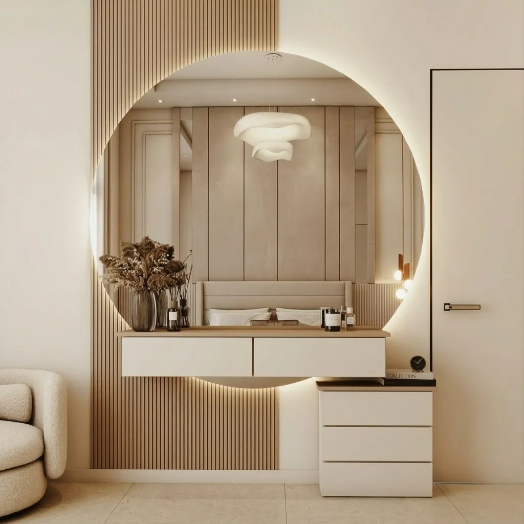 Elevate your interior with the Aalovi Round Mirror Vanity Console by Divine Furniture . A perfect fusion of modern elegance and everyday functionality. Designed to make a statement, this piece features a stunning round mirror enhanced with soft LED backlighting, creating a warm and inviting glow for your daily routine.