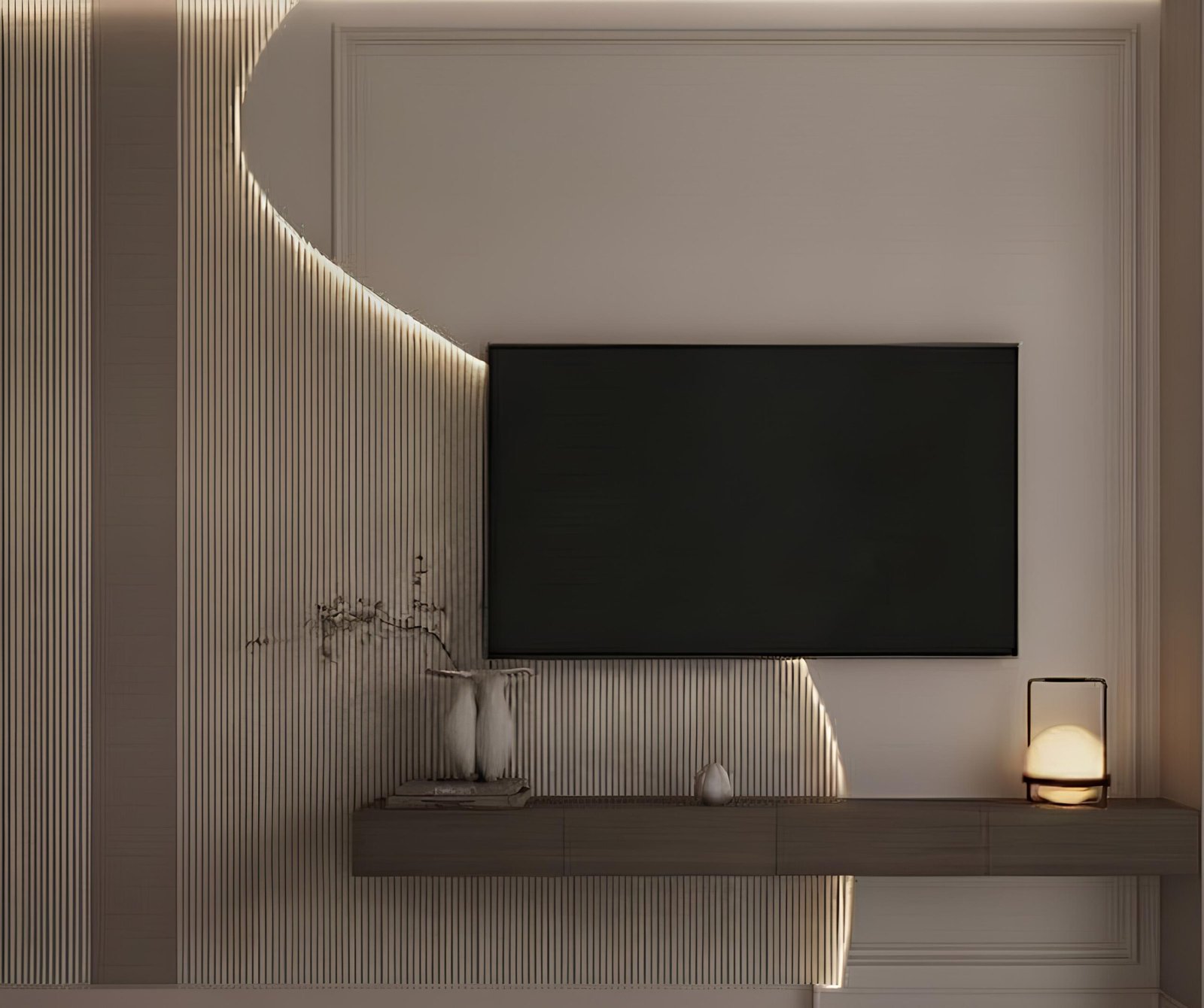 Soft ambient LED lighting is seamlessly integrated along the curved edges, enhancing depth and warmth while highlighting the textured surface. The floating console shelf adds practical display space for décor or media accessories, keeping the look clean and uncluttered.
