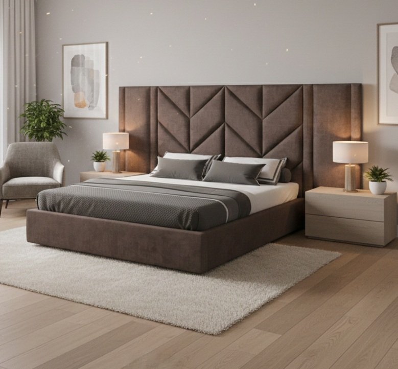Elevate your bedroom with the Divine Atlas Grand High-Headboard Upholstered Bed, designed for those who love bold luxury and modern comfort. Featuring an extra-tall, geometric padded headboard, this bed becomes the ultimate statement piece while offering superior back support for relaxing, reading, or watching TV.
