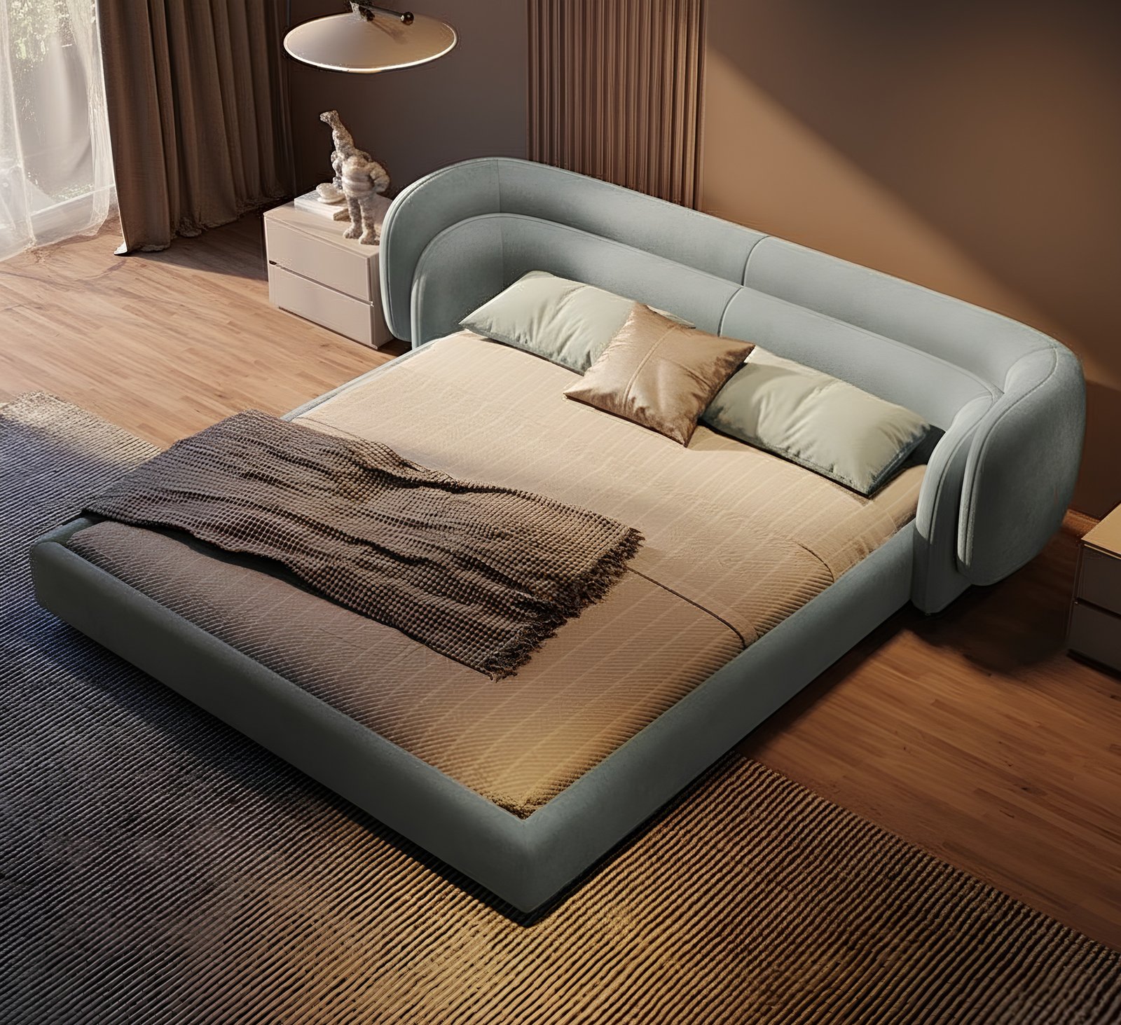 The low-profile frame enhances the modern aesthetic, making it perfect for stylish homes, boutique apartments, and upscale interior spaces. A flawless choice for anyone seeking a bed that feels both artistic and inviting.