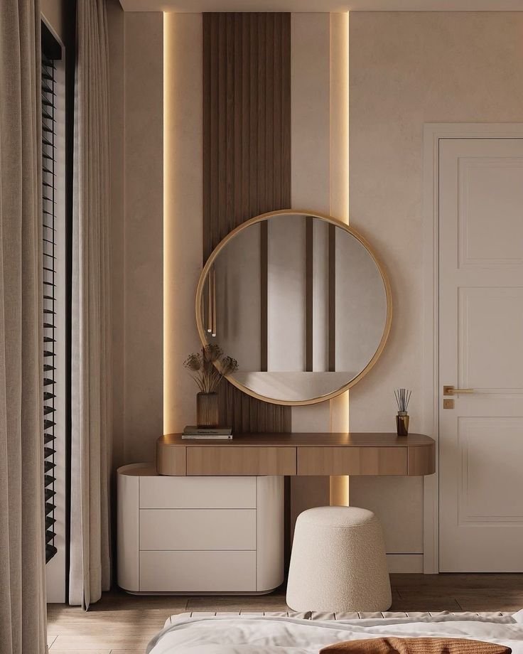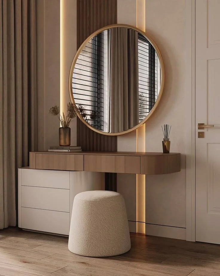 The Eclat Round Vanity Table with Mirror is a refined blend of elegance and utility, designed for modern luxury interiors. Featuring a seamless floating countertop and a statement round mirror with soft LED backlighting, this vanity creates a warm, ambient glow ideal for daily grooming or evening wind-down rituals.