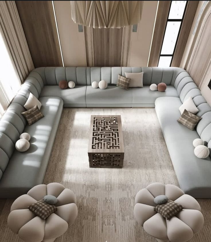 Featuring a clean U-shape layout, this Modern Majlis Sofa offers generous seating while maintaining a sleek and balanced aesthetic. The plush cushioning and ergonomic back support ensure superior comfort, making it ideal for extended gatherings, family occasions, and formal Majlis settings.