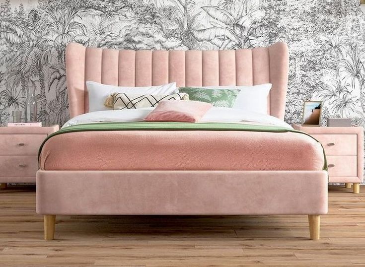 Add a touch of charm and sophistication to your space with this Pink Velvet Bed with Wingback Headboard. Featuring a soft blush pink velvet finish, elegant vertical tufting, and a stylish wingback silhouette, this bed brings warmth and modern glam to your bedroom. The minimalist frame with wooden legs adds a natural balance to its luxurious look.