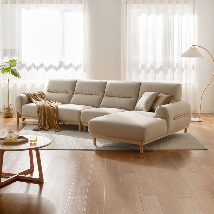 Redefine comfort and style with the SereinEdge Tufted L-Sectional Sofa. Upholstered in soft beige fabric, it features plush tufted backrests, gently curved arms with side accents, and a light wood base for a modern natural finish. This L-shaped design offers a relaxed, cozy layout perfect for Scandinavian, Japandi, or minimal interiors.